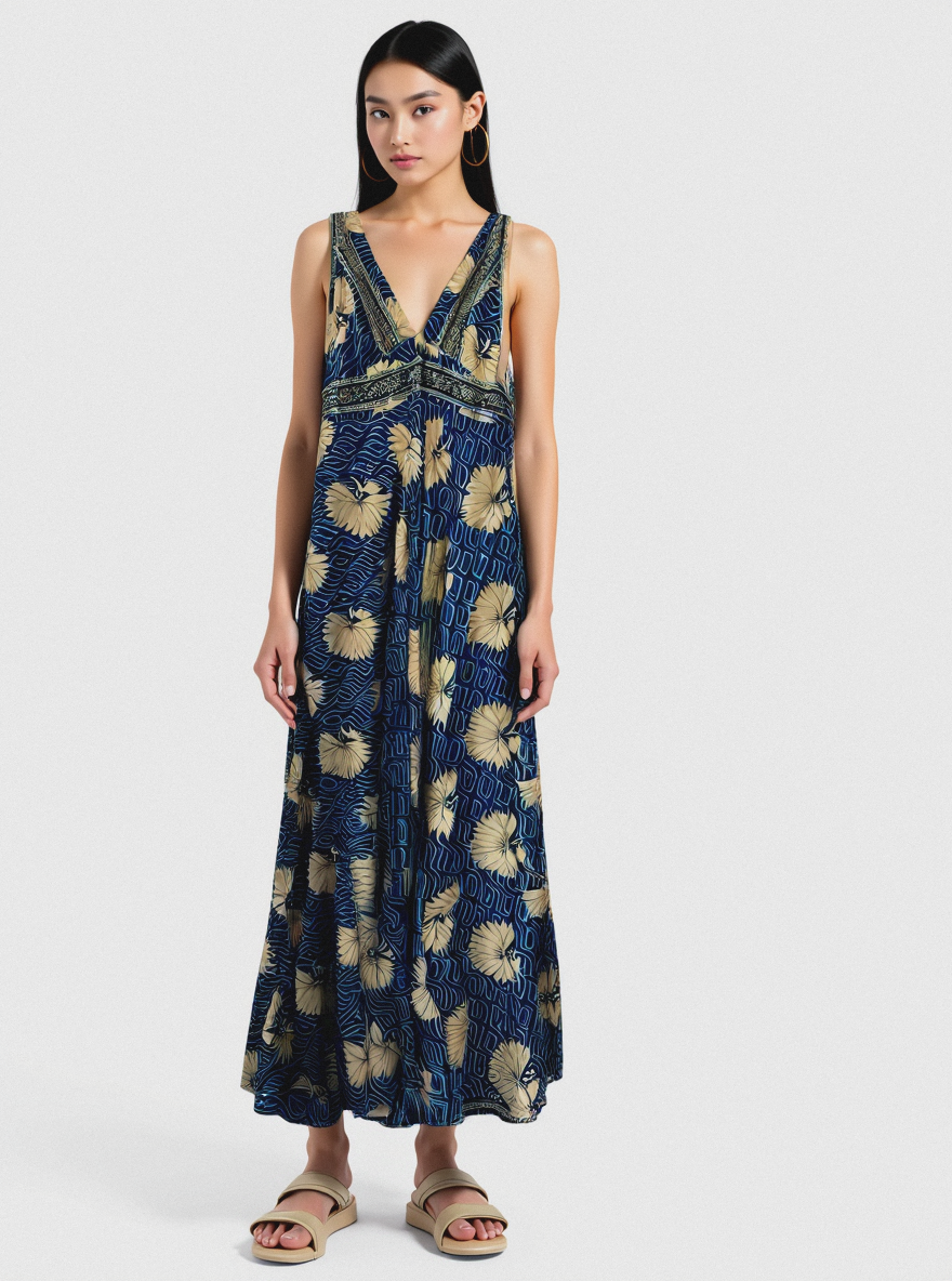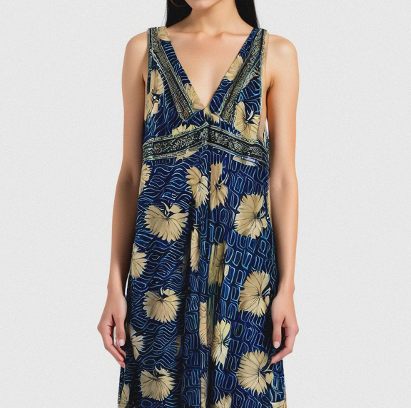 Gece mavisi zemin üzerinde çiçek desenleriyle dikkat çeken, pamuklu astarlı ve rahat kesimli bohem elbise. 36–46 beden arası uyumludur, free size.