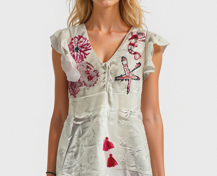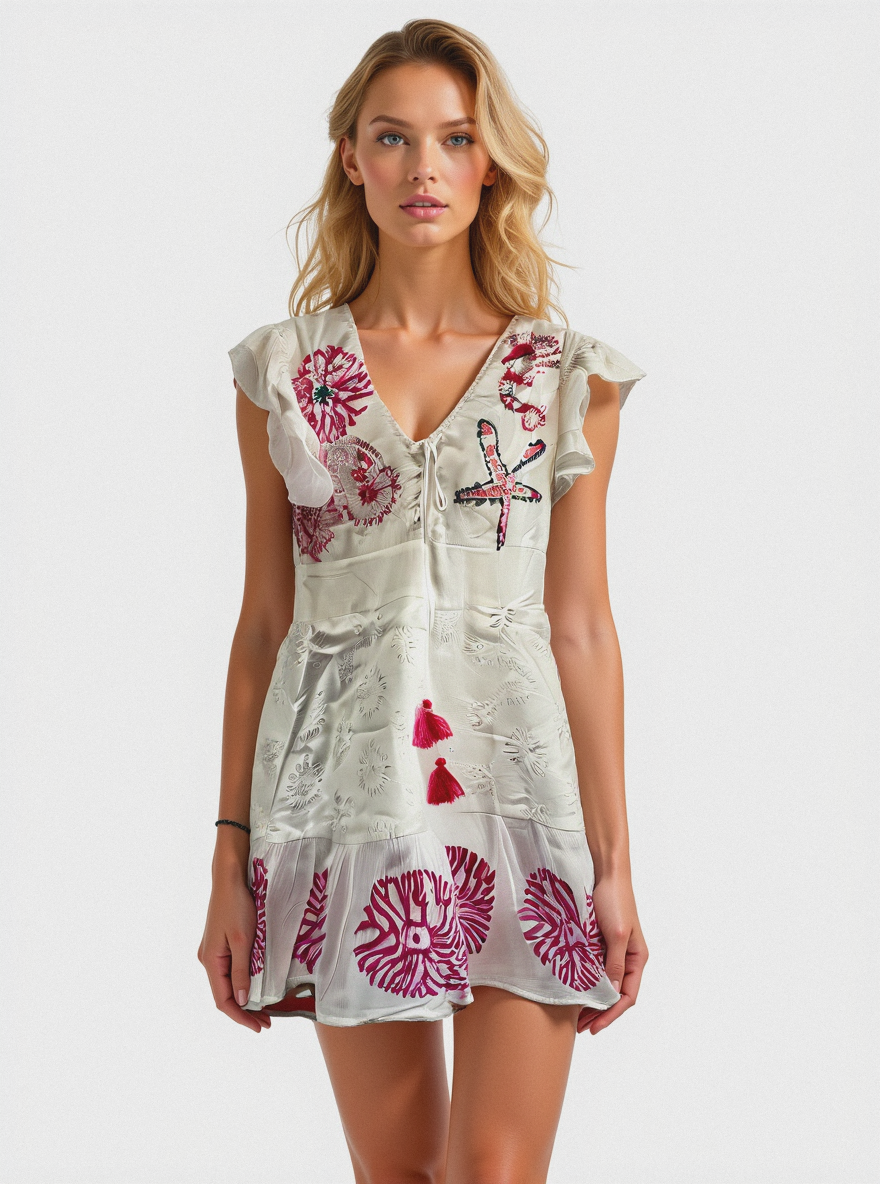 Mercan temalı nakışlar, volan kol detayı ve pamuklu dokusuyla sahil stiline enerjik bir dokunuş katıyor. 36–46 beden arası uyumludur, free size.