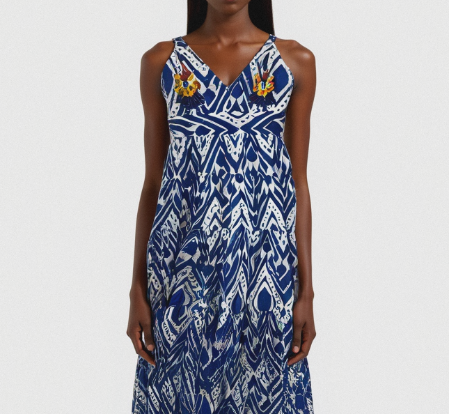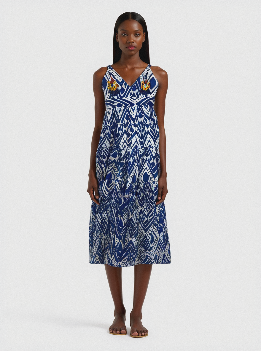 İndigo tonlarında geometrik desenlerle hareketlenen, hafif ve pamuklu astarlı yazlık elbise. 36–46 beden arası uyumludur, free size.