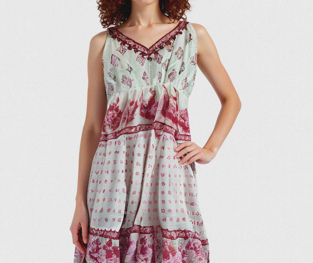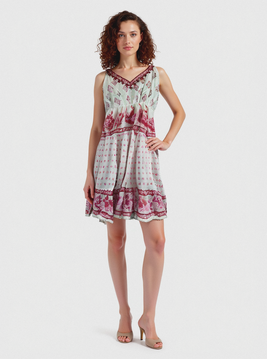 Doğal tonlar ve etnik desenlerle hareketlenen pamuklu astarlı bu elbise, yazın hafifliğini stilinize taşır. 36–46 beden arası uyumludur, free size.
