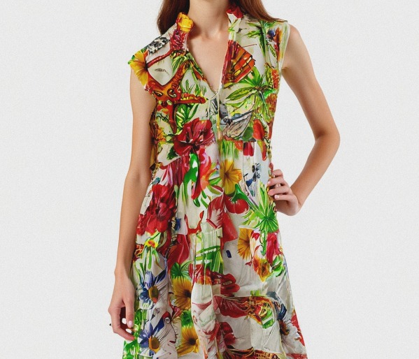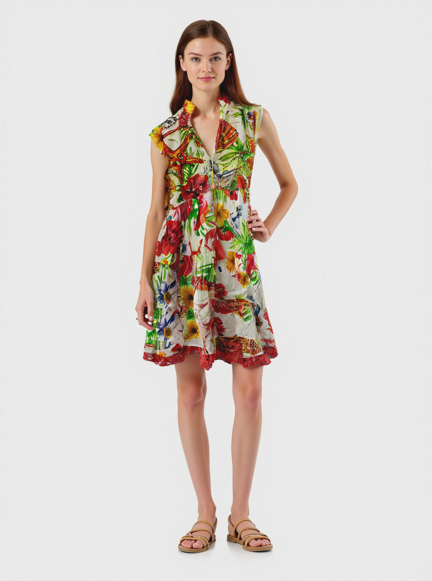 Canlı çiçek desenleri ve pamuklu astarıyla yaz enerjisini taşıyan hafif, rahat ve renkli mini elbise. 36–46 beden arası uyumludur, free size.